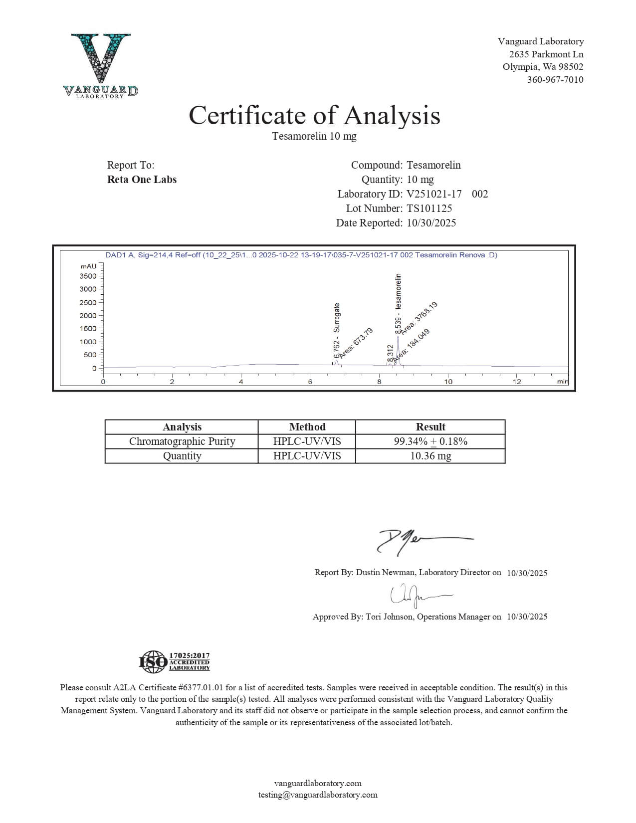 RetaOne Labs Tesamorelin 10mg represents the gold standard in research-grade peptide compounds. Manufactured under strict quality controls and verified through comprehensive analytical testing. Each vial contains 10mg of 99%+ pure tesamorelin, suitable for research applications.